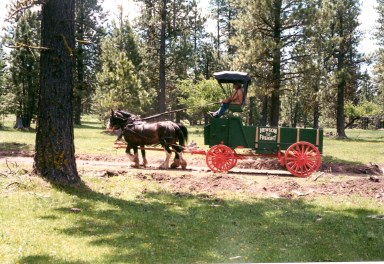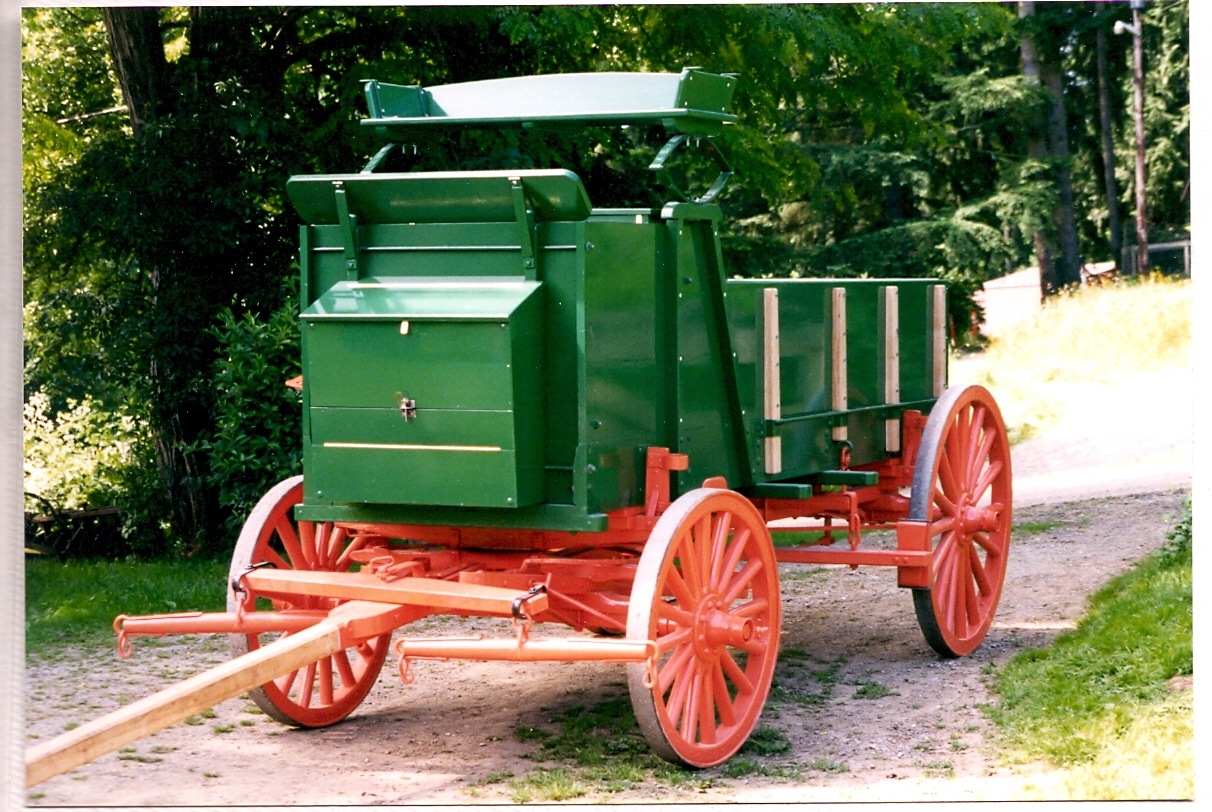 The running gear for the freight wagon pictured below came to us needing some help. Two wheels were in need of repair and a new reach, pole & brake system had to be built. This is a heavy gear, having 2″ steel axels and Archibald wheels. Once those tasks had been completed, we decieded to build a California Rack style box for it. This type of box was used extensively for freighting in Washington, Oregon, Idaho and California. To build it, we used plans from the Ivan Collins Collection. We modified it because we intended to use it as a frieght outfit on our State Draft Horse Association’s wagon trains. The changes made were the addition of solid side boards, sliding belly boxes, a storage box with lid under the seat and a box on the front, patterened after the World War I Army Escort Wagons.